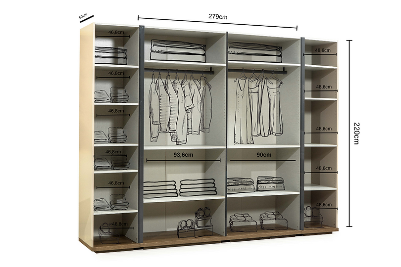 6-deurs Kleerkast: 279 x 220 x 61 cm